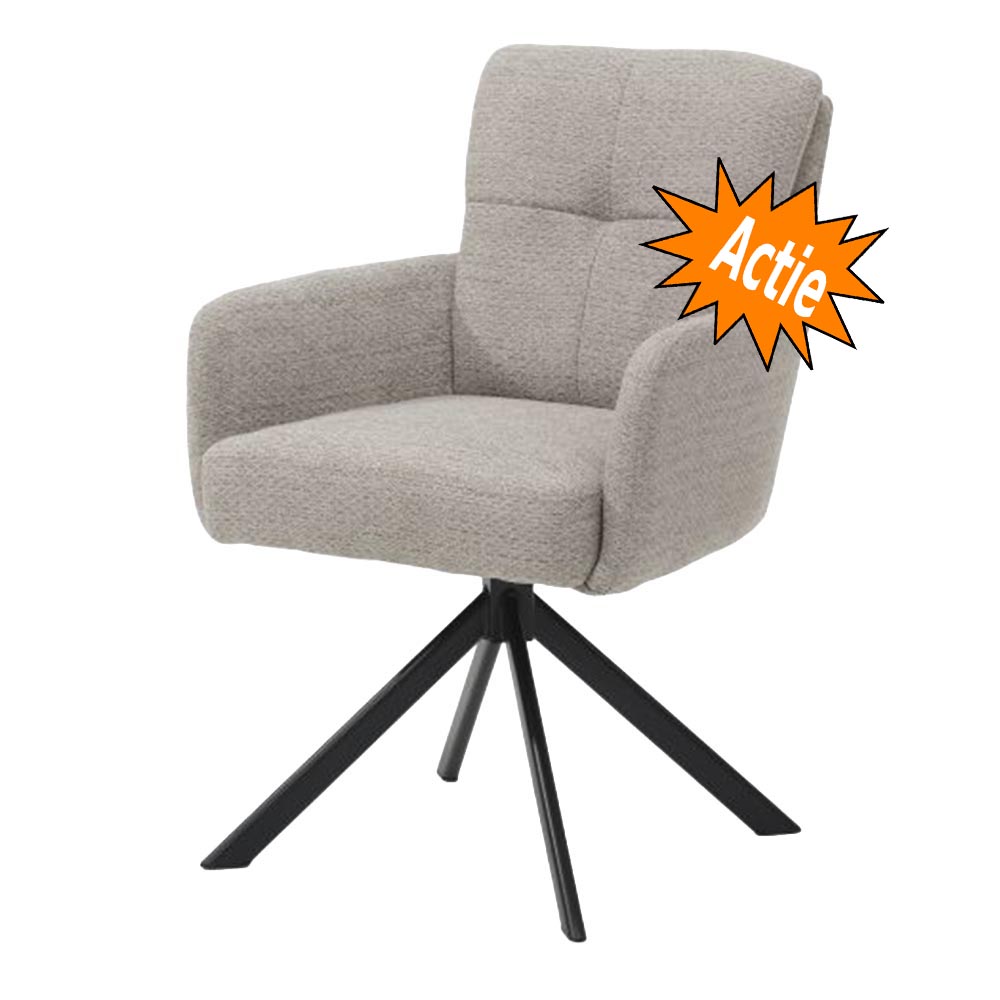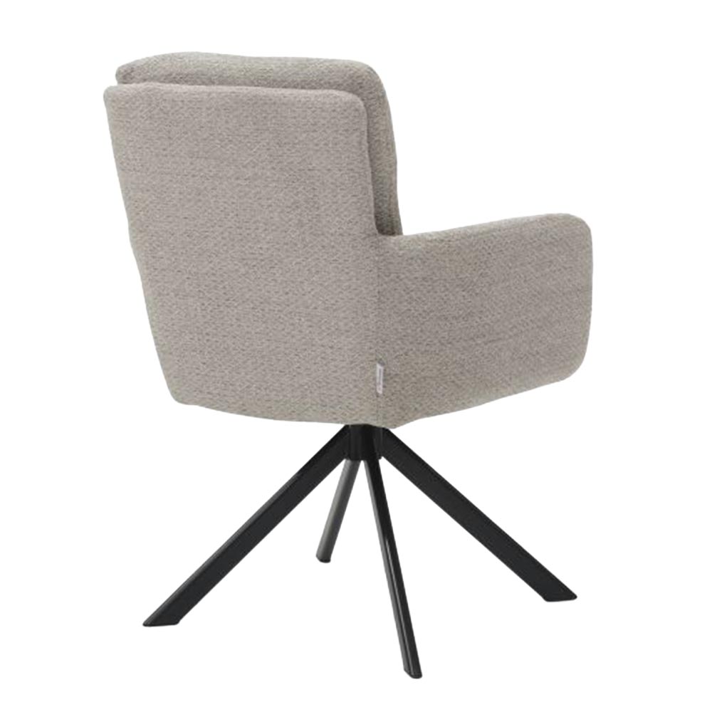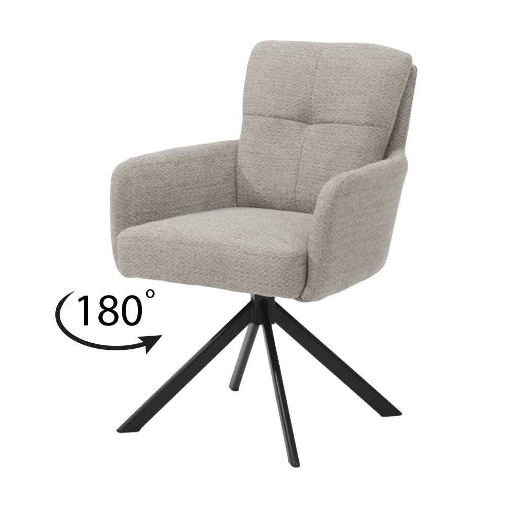 Dankzij de 180° draaifunctie met automatische terugkeer schuif je moeiteloos aan en staat de stoel altijd netjes recht aan tafel. Het slanke metalen onderstel geeft de stoel een moderne en luxe uitstraling.